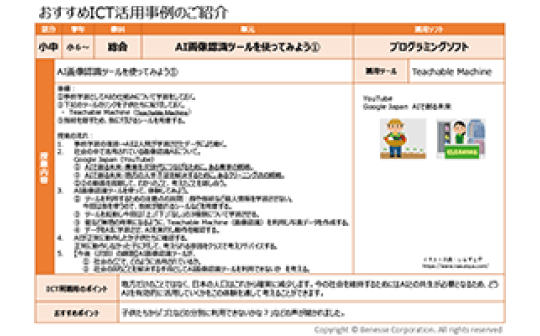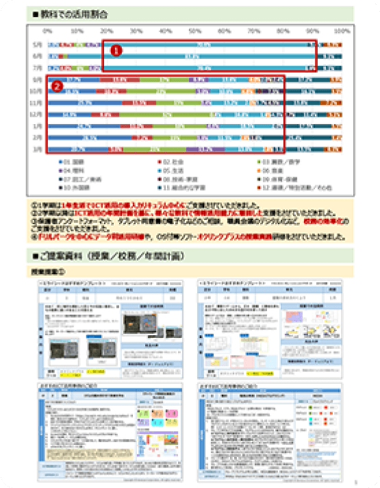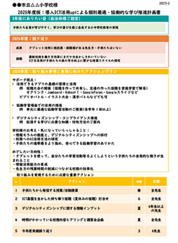 主体的な学びを実現するための授業について支援員からご提案。授業提案書のフォーマットを活用し、めあてや使用ツールもわかりやすく可視化。