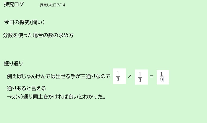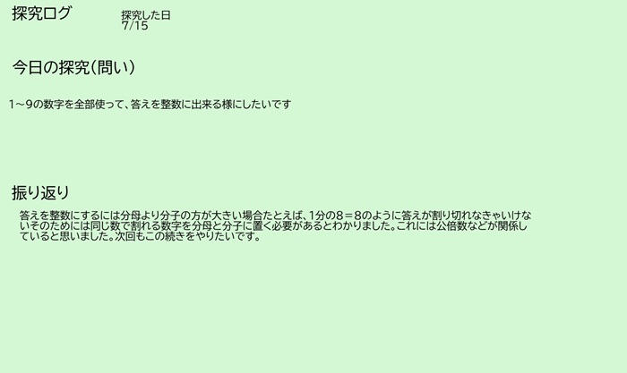 さらに、同じテーマに取り組む子どもたちでペアやグループを組み、互いのアイデアを交換したり、自作問題を解き合って感想や改善点を伝え合ったりする「協働探究」も同時に進んでいきます。アウトプットとフィードバックの往復を通じて、探究がさらに深まっていきます。