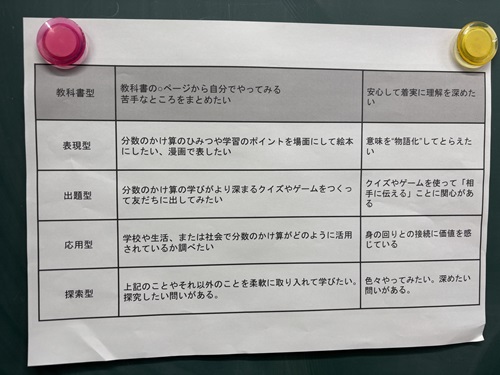 (黒板には探究の型の一覧が貼られており、子どもたちはこの中から自分に合った表現方法を選択します)