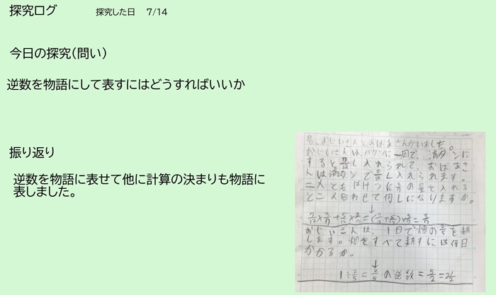 教師は、子どもたちの探究ログの言葉を引用し共有。子どもの学びに向かう姿を価値づけ、探究の意識を高めます。