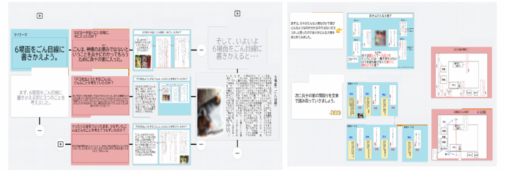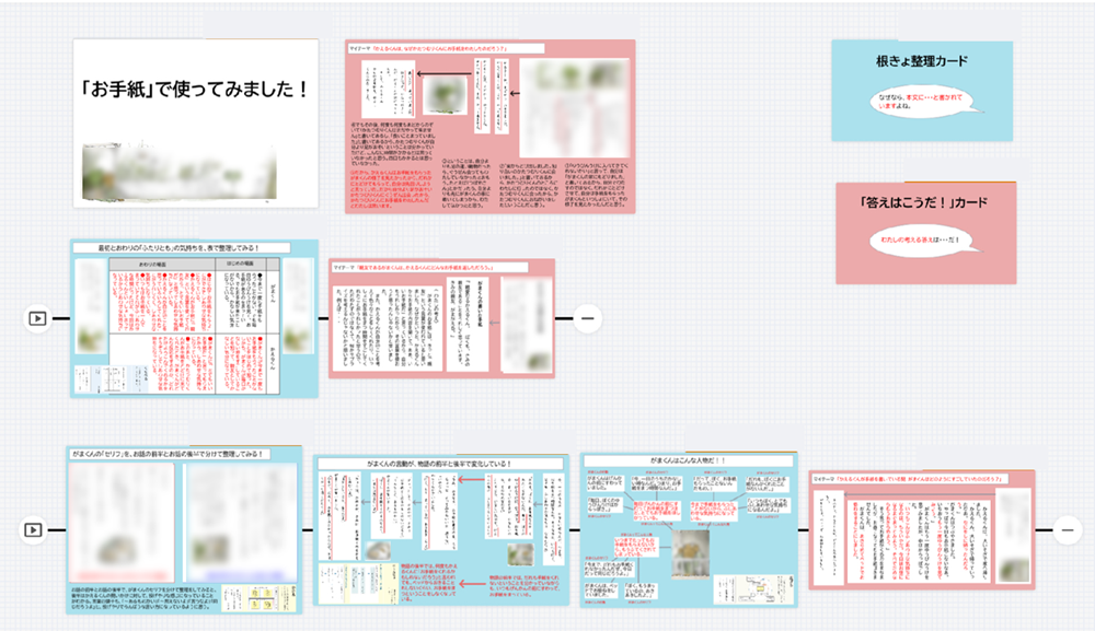 子どもたちは、本文から根拠になりそうな叙述をスクリーンショットを使ってどんどん取り上げ、「順序づける」「表で比較する」「まとまりに分ける」といったフォーマットに合わせて整理をしていきました。中には「こんなカードをつくってもいい?」と、新たなフォーマットをつくり出す子どもたちもいて、今後も様々な場面でこのカードは使えるなと思いました。