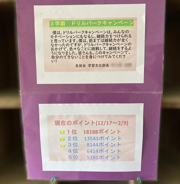 このキャンペーンは、昨年度の3年生の「せっかく貯めたシードポイントが、何か良いものに変わったらいいのに」という一言がきっかけでした。それを受けた当時の生徒会学習文化部の先輩方が、「シードポイントに応じたご褒美が欲しい」と先生に相談して、先生方の協力もあって、この「ドリルパークキャンペーン」が実現しました。2年目となる今年は、私たちが運営を引き継いで実施しています。