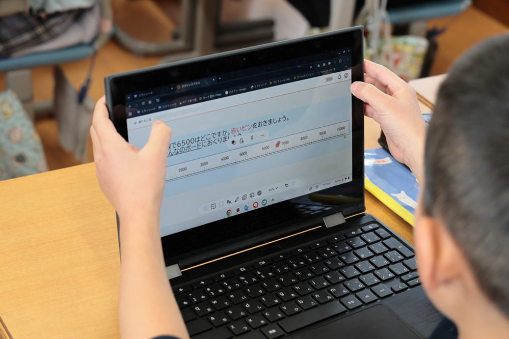 2.本時の課題として、「数直線上の6500はどこか」を予想。オクリンクプラス上でピンを置かせる。反転学習の要素を取り入れ、前時終末のテストパークと合わせて取り組ませることで、本時の話し合いにスムーズに取り掛かれるようにするとともに、児童が見通しをもてるようにする。