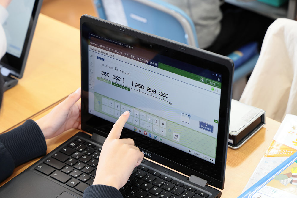 これまではノートで練習問題に取り組ませてきましたが、正直なところ、見取りが不確かだったなという反省があります。児童に取り組ませているけれど、なんとなくできている感で終わっていました。児童同士で少し見合って、自分の答えを消して書き換えてしまうこともありました。それでは、本当に誰がどこでつまずいているのかが見えてきませんでした。また、紙のプリントやノートだと、教師が全部の採点を見なければならず、この物理的な負荷が高かったんです。丸付けに追われてしまって、本当に支援が必要な子に声をかけるタイミングを逃してしまうのが、これまでの課題でした。