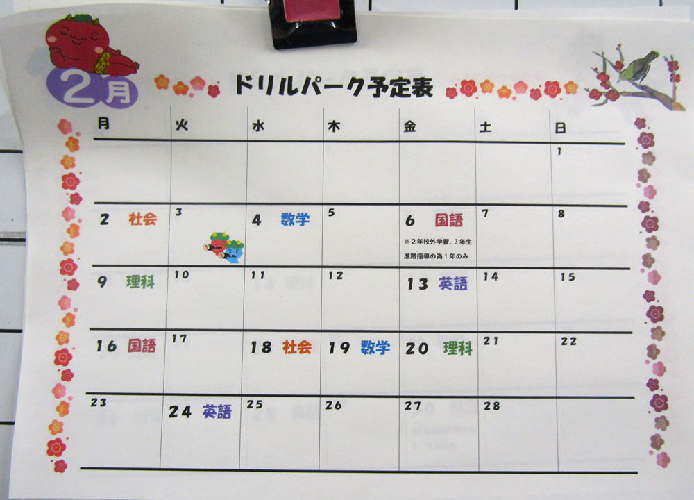 ドリルパーク予定表 教科名が書かれている日の朝学習の時間は全学年でその教科のドリルパークに取り組む