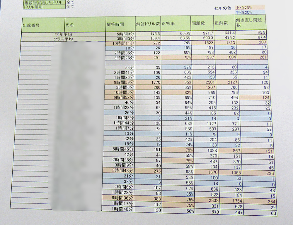 本田中学校のとあるクラスのドリルパークの活用状況データ