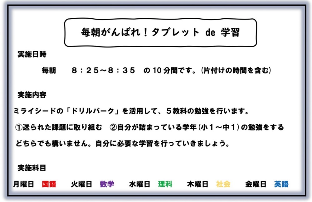 8時25分から35分までのわずか10分間ですが、時間を固定して取り組むことで「確実にタブレット学習に向かえる」環境が整いました。朝学習の再開以降、ミライシードの活用が以前より確実に進んでいると感じています。
