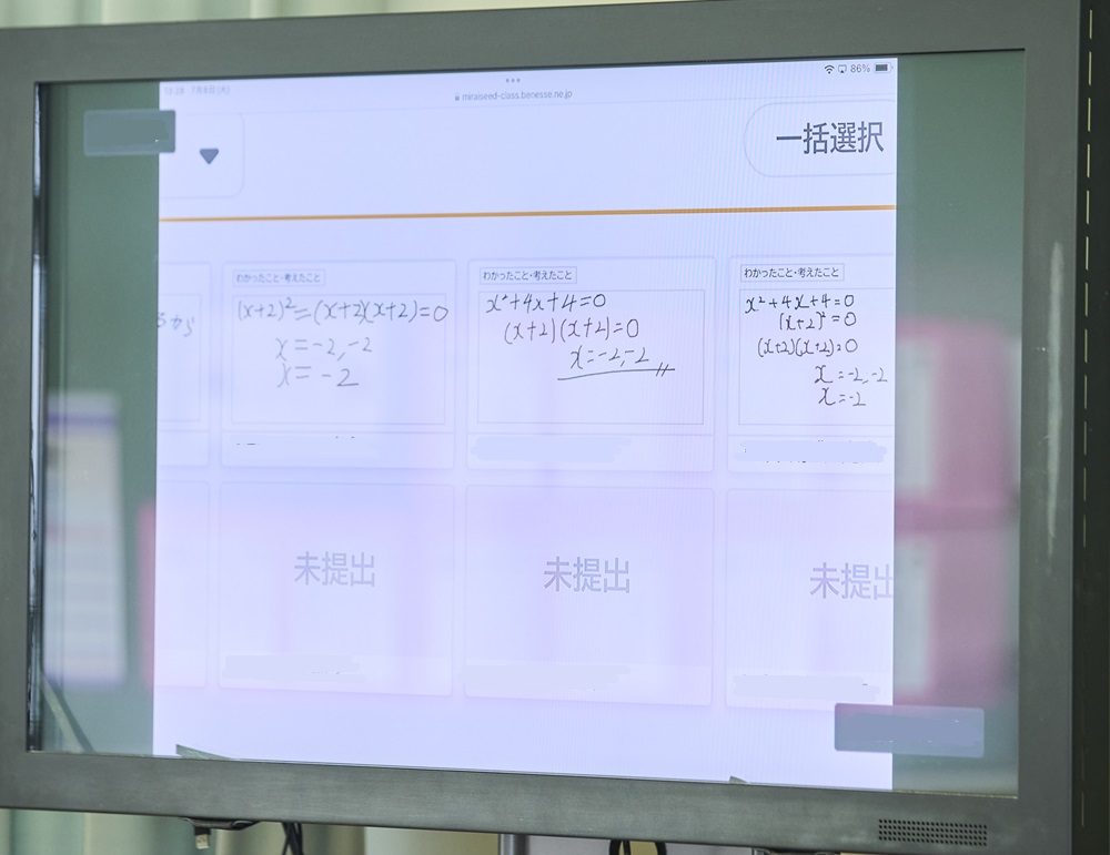 そこで、なぜ解が1つになるのかをクラスのみんなで考える時間を設けました。オクリンクプラスのボード上にそれぞれの生徒が途中式を書き込んでいくのですが、みんなの考え方のプロセスが見えるので、教員が正解を教えるのではなく、他の生徒の思考の跡から気づくケースがが出てきます。また、従来のホワイトボードや黒板と異なり、授業終了後もデータが残るため、前回の学習内容を簡単に振り返ることができる点も便利ですね。