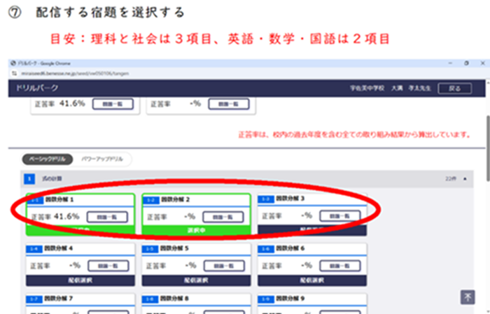 「学校全体でドリルパークを活用するため、教員向けの研修会を実施。ログイン画面から配信日時の設定まで、課題配信の過程がわかる資料を準備し、全教員が操作できるようにしました。最初はICTに苦手意識を持つ先生もいらっしゃいましたが、先生同士が協力して取り組みを支え合うことで、現在では全学年でドリルパークを使った家庭学習を実施しています。課題配信の量については、教科間でのすり合わせを経て、最終的に2-3モジュール×5教科という設定にしています。」