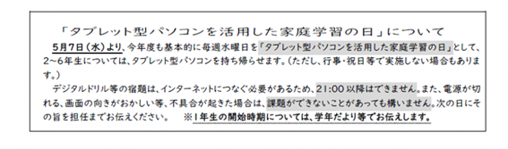 初めの活用は、「週1の持ち帰り」からでした。毎週水曜日を持ち帰りの日と決めて、ドリルパークの課題配信を行うよう、2年生以上を受け持つ先生方へお願いしました。当時はまだ持ち帰りを始めていなかったものですから、家庭への周知も必要でした。学校だよりで持ち帰りを始める旨を伝え、「wi-fiや端末の都合で課題ができなくても、宿題忘れにはなりません」「トラブルがあった場合は保護者の方も端末を見てあげてください」「そもそもドリルパークとは、こういったデジタルドリル」といった説明も記載するなど、丁寧にアナウンスし続けました。