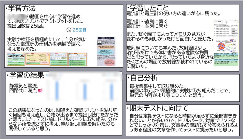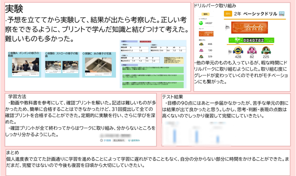 生徒たちが時間をかけて取り組んだ分、完成したふりかえりの内容は予想以上に充実しており、大きな手応えを感じました。ドリルの取り組み状況とテストの結果を合わせて確認しながら今後の学習の見通しを立てている生徒もいれば、テストの結果と授業中の取り組みを照らし合わせ、自分に合った学び方を考えている生徒もいました。それぞれがデータと向き合い、自分なりの視点でふりかえりを行っていたことが印象的でした。