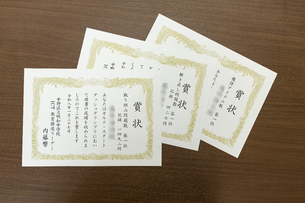 イベントに参加した生徒からは「学習時間が増えた」「勉強する習慣がつくきっかけになった」といった声が寄せられ、短期間でも行動変容が起きていたことが確認できました。中には、2週間で1,000問以上取り組んだ生徒もおり、意欲的に学習を進める姿が見られました。上位の生徒には表彰状も手渡しました。
