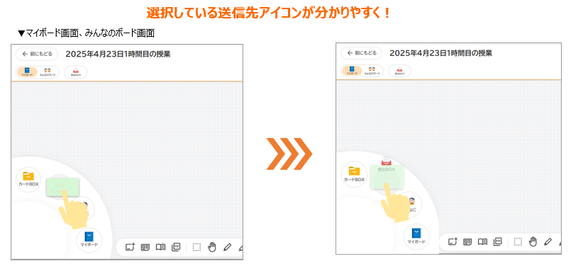 カード送信時に選択されている送信先アイコンがわかりにくいという課題を改善。カード送信時の送り先がすぐわかるので、子ども達も迷わず送ることができます 。