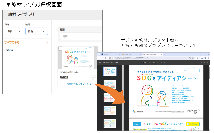 教材選択時に「プレビュー」ボタンを押すことで、教材内容を確認できます。