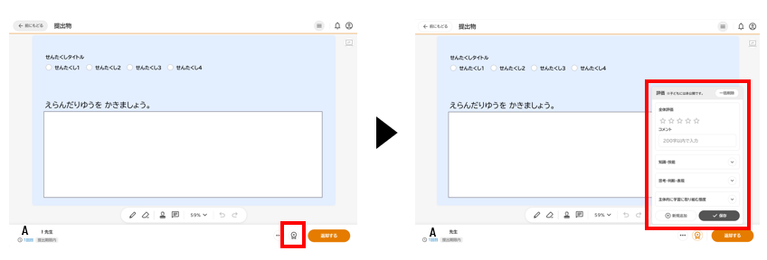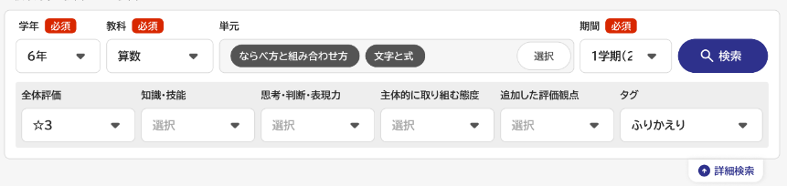 学年、教科、期間(学期)を指定すると、その期間で子どもが提出したカードを授業をまたいですべて一覧で見ることができます。また、詳しい検索も可能で、たとえば「6年生・算数・ふりかえり」という観点で検索すれば、子どもの思考の深まりや表現の変化を一度に確認できます。