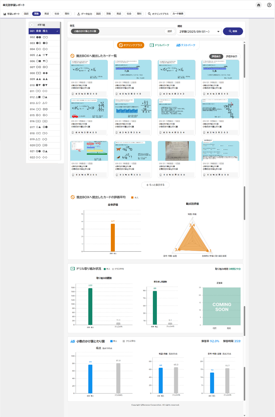 先生カルテの「単元別学習レポート」では、ドリルの取り組み状況や提出したカードにつけた評価、テスト結果などを単元ごとに一覧で確認できます。