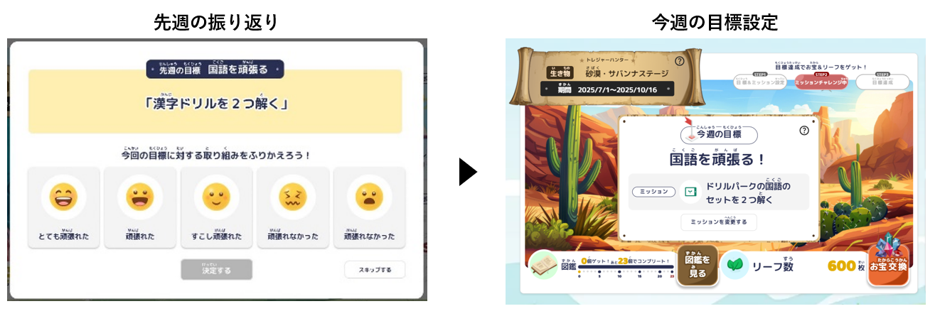 「目標設定 → 学習 → ふりかえり」のサイクルを通じて子どもに学びの定着を促し、先生がそうした子ども一人ひとりのがんばりを把握し、寄り添った指導や評価につなげることを可能にします。