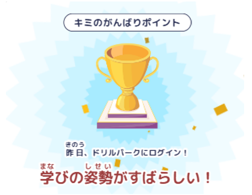 先生の個別の声かけが難しい時でも、子ども自身が子どもカルテを開くことで自分だけに表示される「きみのがんばりポイント」を確認できます。