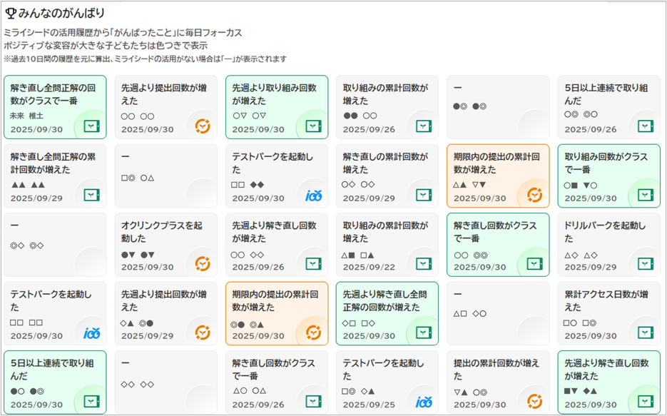 先生カルテの「みんなのがんばりピックアップ」機能を使うと、前日の子どもたちのがんばりが一覧で表示されます。注目すべき子どもも自動でピックアップされるので、普段は気づきづらいがんばりにも自然に気がつくことができ、子どものやる気をアップさせるための声かけの材料として活用いただけます。