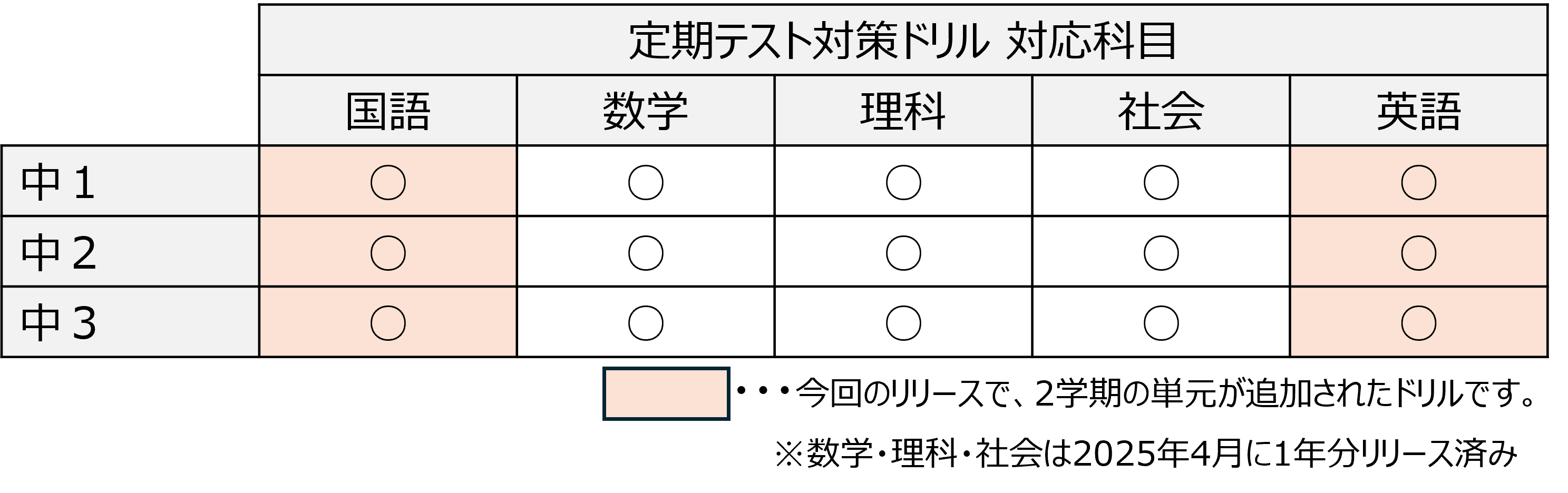 2025年8月25日に、中学生向けの「定期テスト対策ドリル」の国語・英語に2学期分のドリルを追加しました。