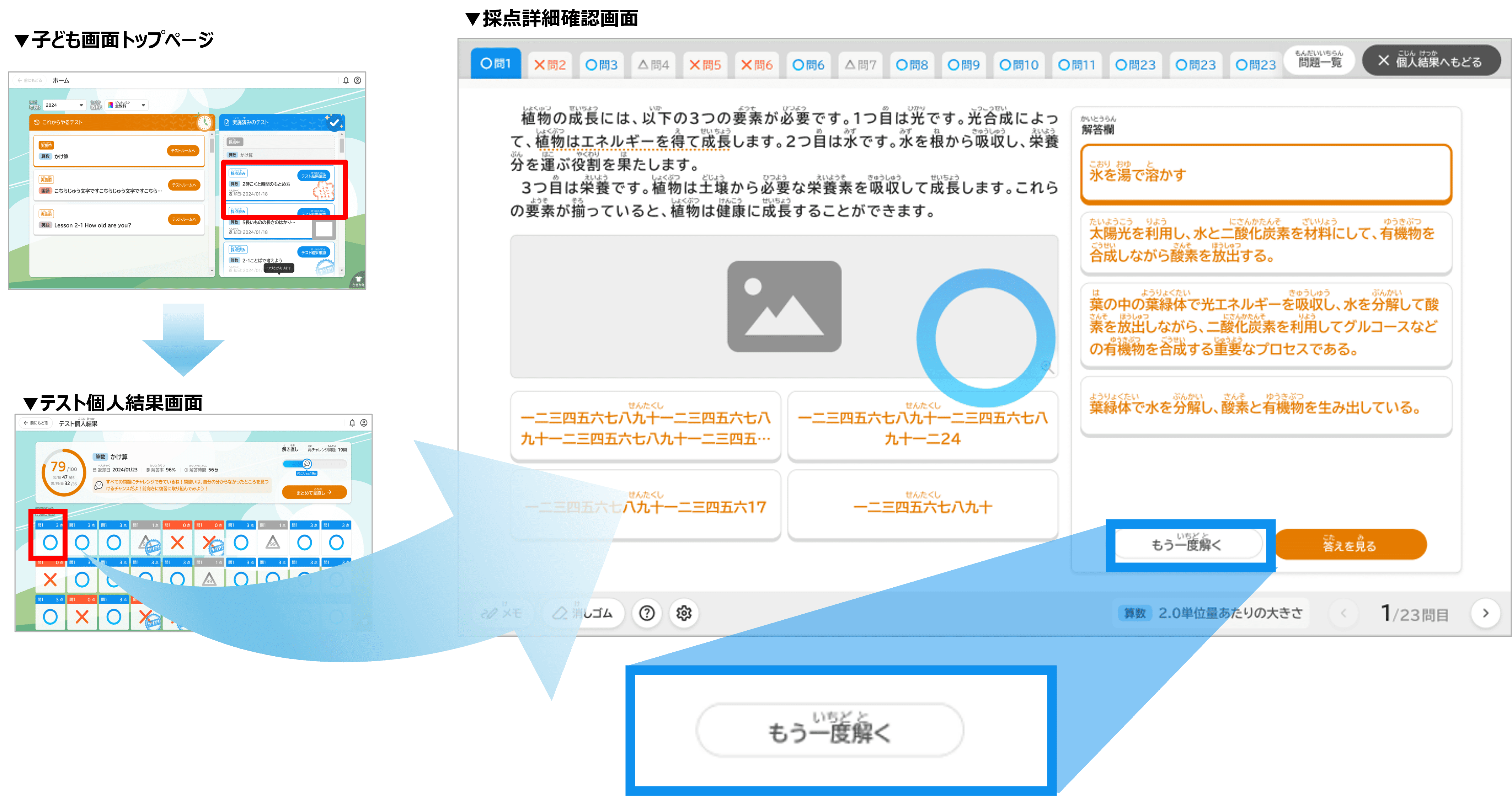 今回の機能リリースに伴い、子ども画面の採点詳細確認画面に「もう一度解く」ボタンを追加いたしました。