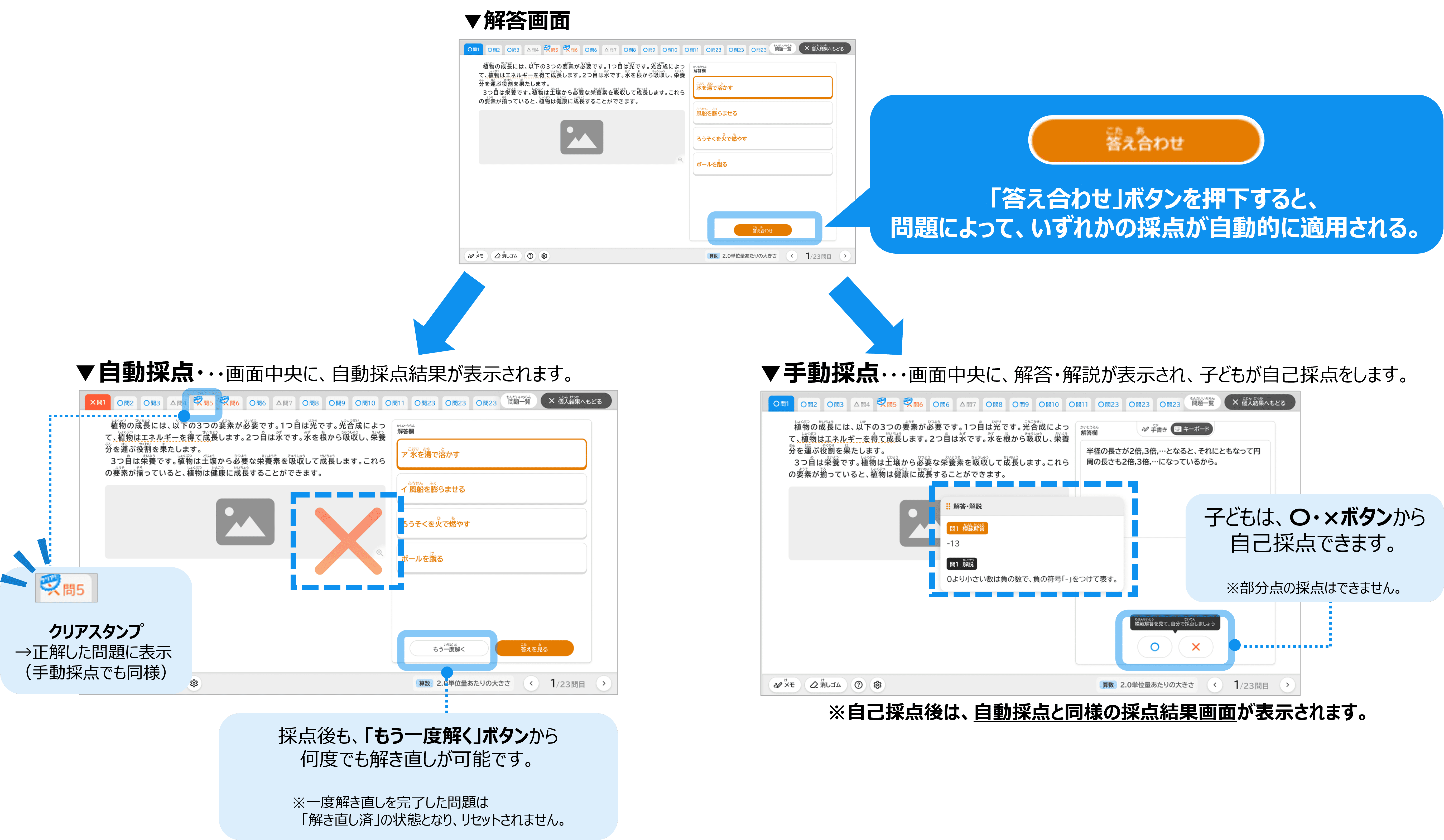 また、解き直した問題は、解答画面の「答え合わせ」ボタンを押すことで採点可能です。 問題によって、自動採点または手動採点が自動で適用されます。