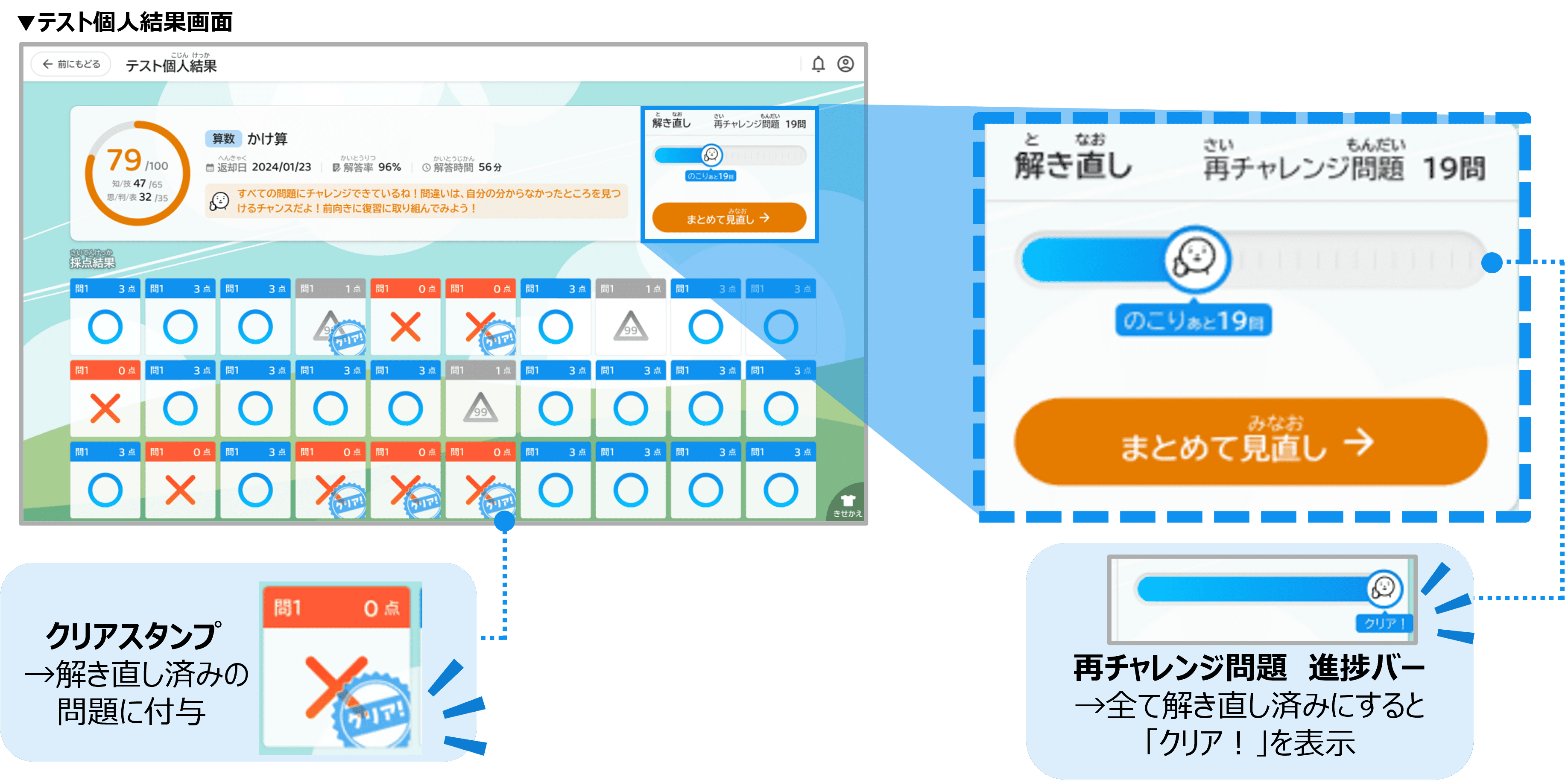 さらに、解き直し済みの問題にはクリアスタンプが付与され、すべての再チャレンジ問題を解き直し済みにすると進捗バーに「クリア!」と表示されます。