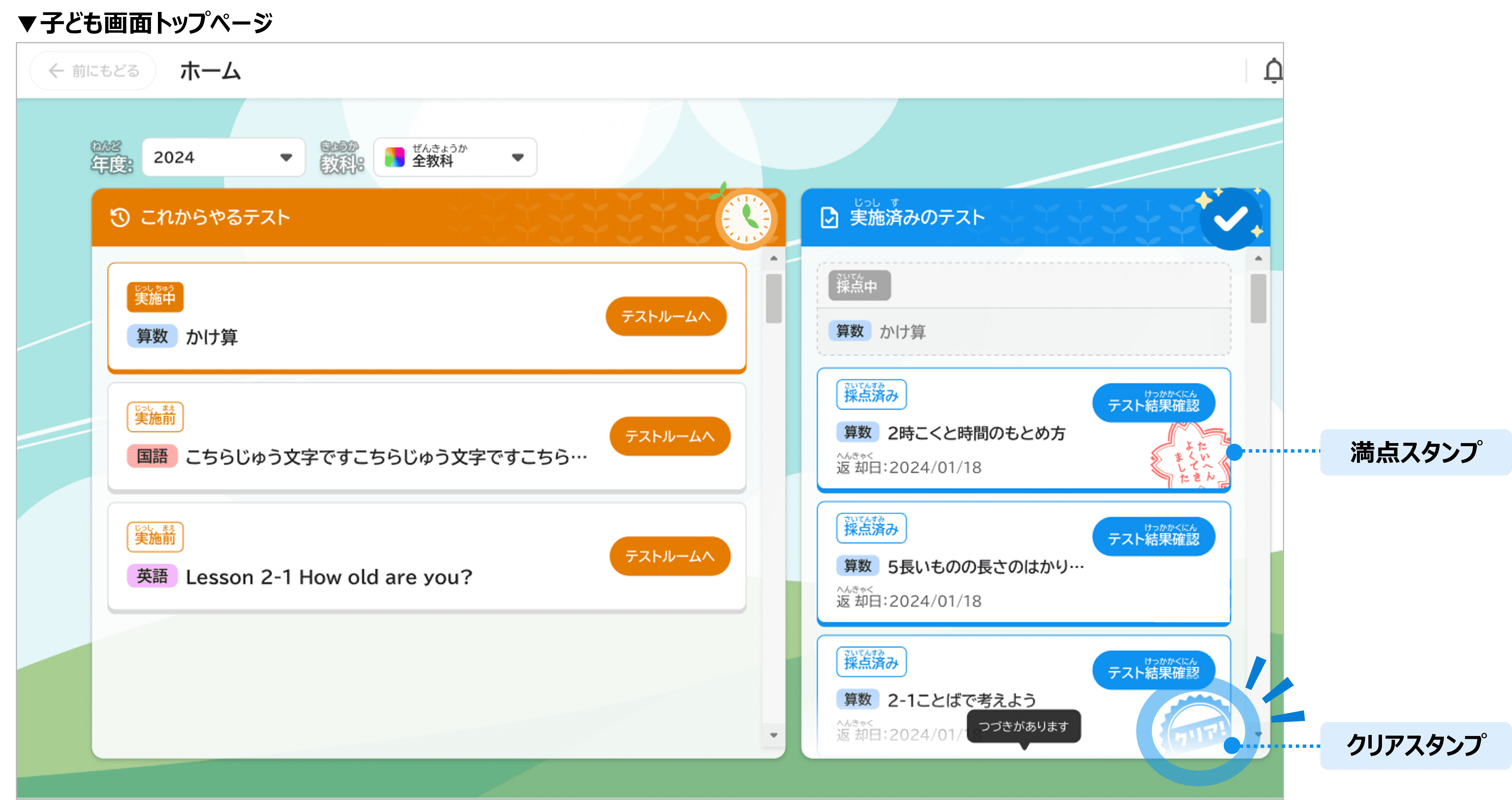 また、再チャレンジ問題を全て解き直し済みにすると、子ども画面トップページの「実施済みのテスト」一覧にもクリアスタンプが付くため、子どもたちも自分の努力が見える化されて達成感を得やすい仕組みになっています。