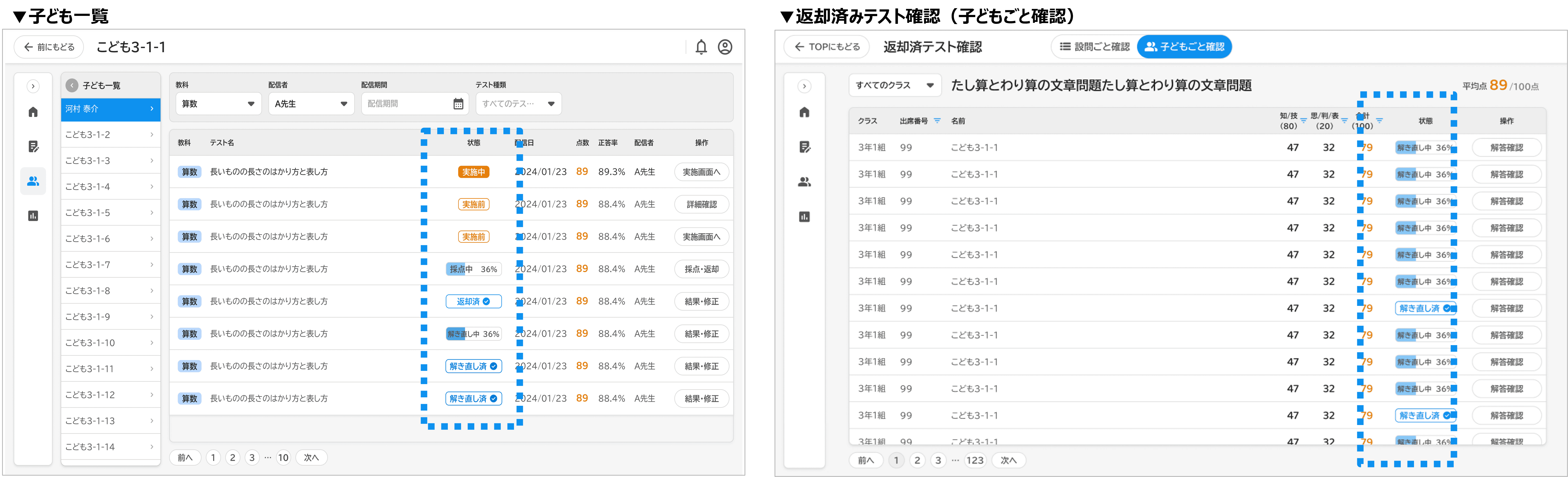 先生画面でも、「子ども一覧」または「返却済みテスト確認」画面の「子どもごと確認」から、子どもの「再チャレンジ問題」の解き直し進捗状況(解き直し中/解き直し済)を確認できます。