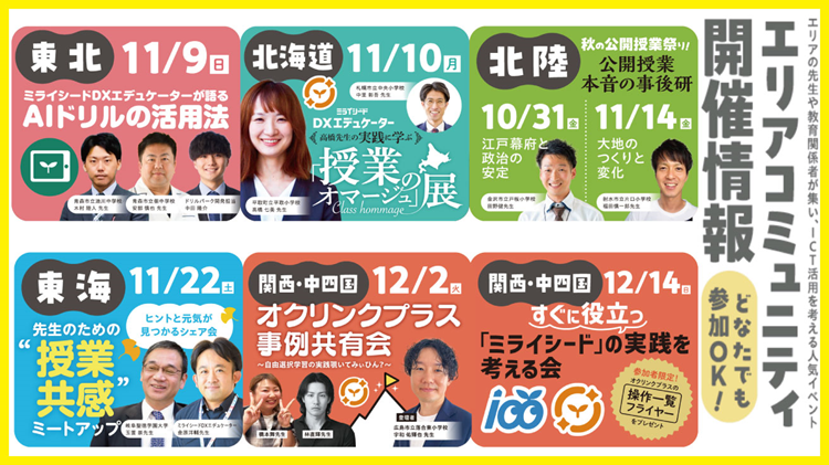 11、12月に開催するのは、東北、北海道、北陸、東海、関西・中四国の5エリア。ミライシードの活用やICTの活用についてご興味のある先生方は、ぜひご参加ください!