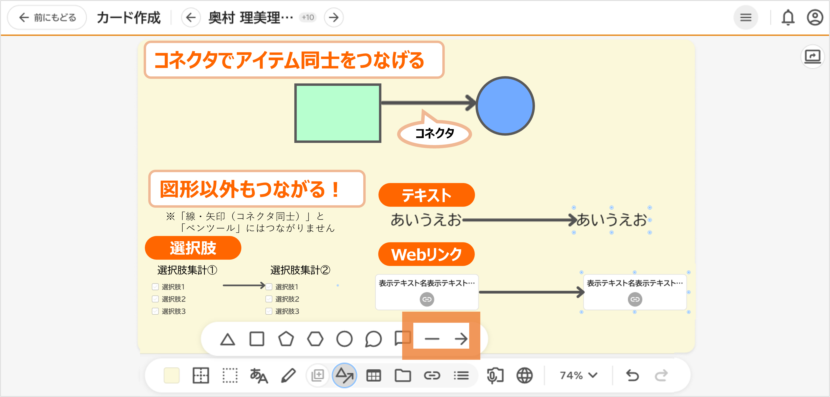 コネクタ機能は、カード上にあるアイテムをコネクタの「線・矢印」でつなぎ、複数のアイテム同士のつながりや関係性を自由に表現できる機能です。線・矢印をカード上のアイテムに近づけると、アイテムの頂点や辺とつなげることができます。