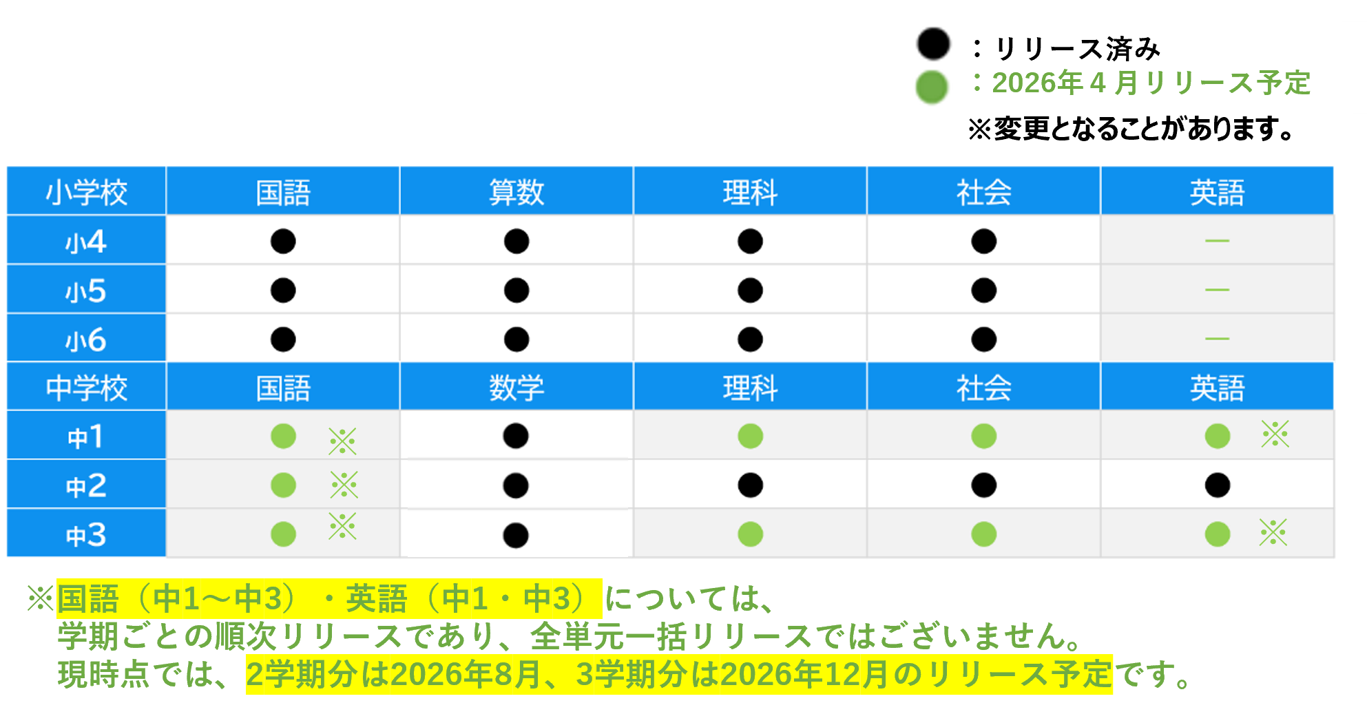 ※国語(中1~中3)・英語(中1・中3)については学期ごと順次リリースとなります。現時点では、2学期分は2026年8月、3学期分は2026年12月のリリース予定です。