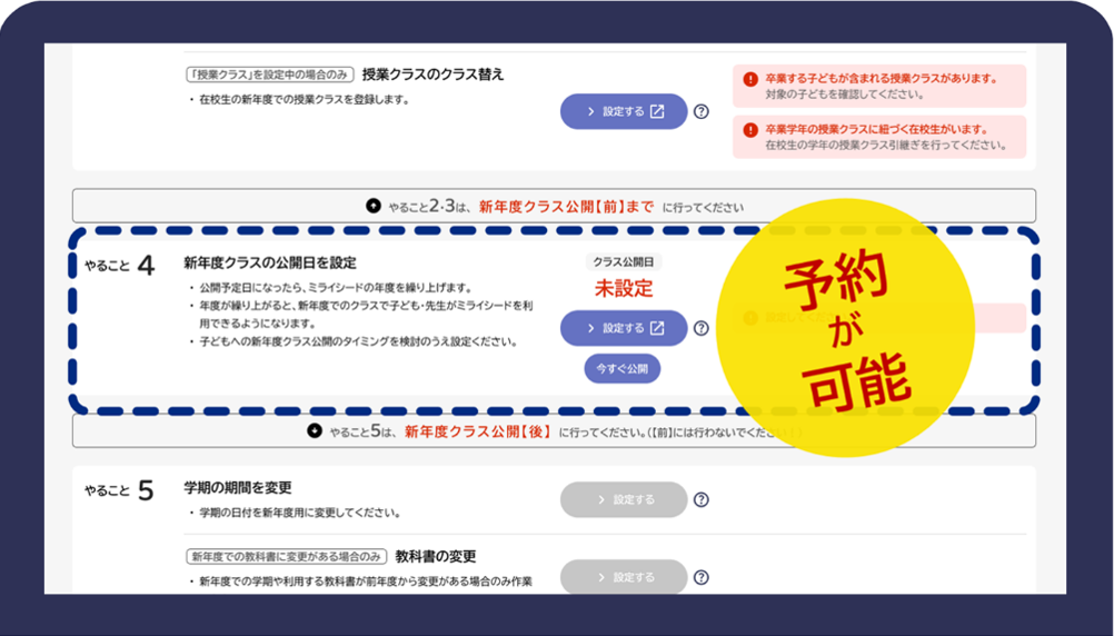 ミライシードの年度の繰り上げタイミングを、日付指定して予約しておける機能を追加します。前もって新年度の準備をしていただけるようになります。