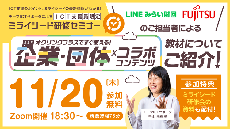 11月は「オクリンクプラスですぐ使える!企業団体コラボコンテンツ 教材についてご紹介! 」のテーマで開催いたします。