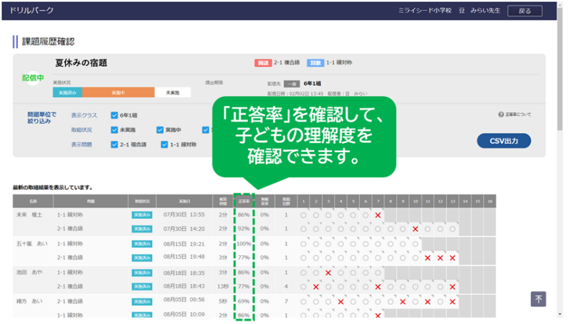 冬休み明けの授業では、子どもの取り組み履歴から正答率が低い問題を復習させるなど、3学期の授業開始に生かすことができます。