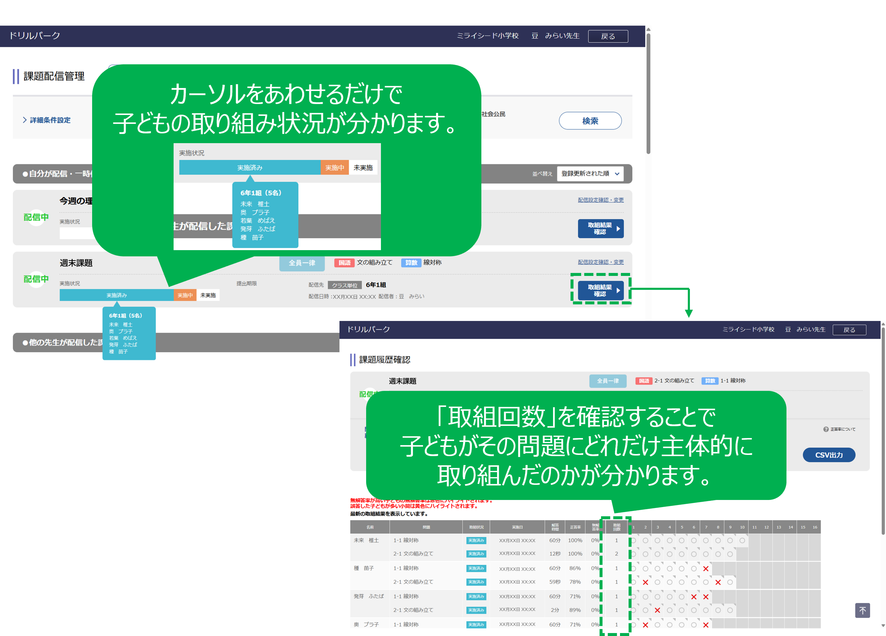 先生が出した課題の「実施状況」がグラフで表示され、カーソルを合わせるだけで子どもの取り組み状況がわかったり、「取組結果確認」から取組回数を確認することができたり、デジタルだからこそ子どもたちの課題への取り組みの様子がわかります。