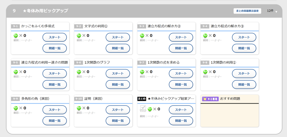 2学期までに学んだ単元から問題を厳選した「冬休み用ピックアップ」は、1つのドリルにつき10~15分で取り組める問題構成になっております。