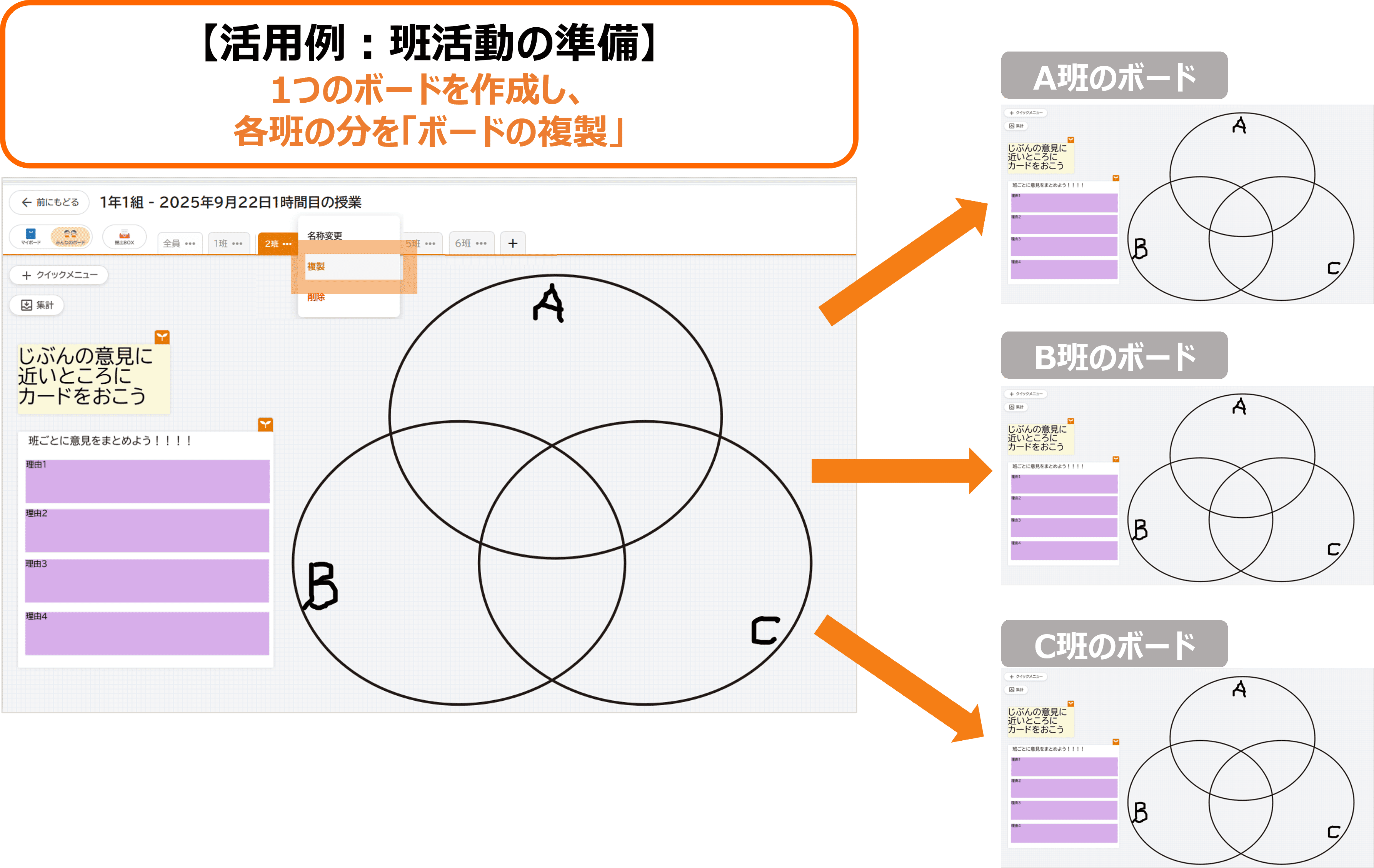ボタン1つで簡単にボードの内容すべてを複製できるので、例えば 班活動の準備では、先生が1つのボードを作成した後、班の数だけボードの複製を行い、班ごとに同じ内容のボードをスムーズに共有することができます。
