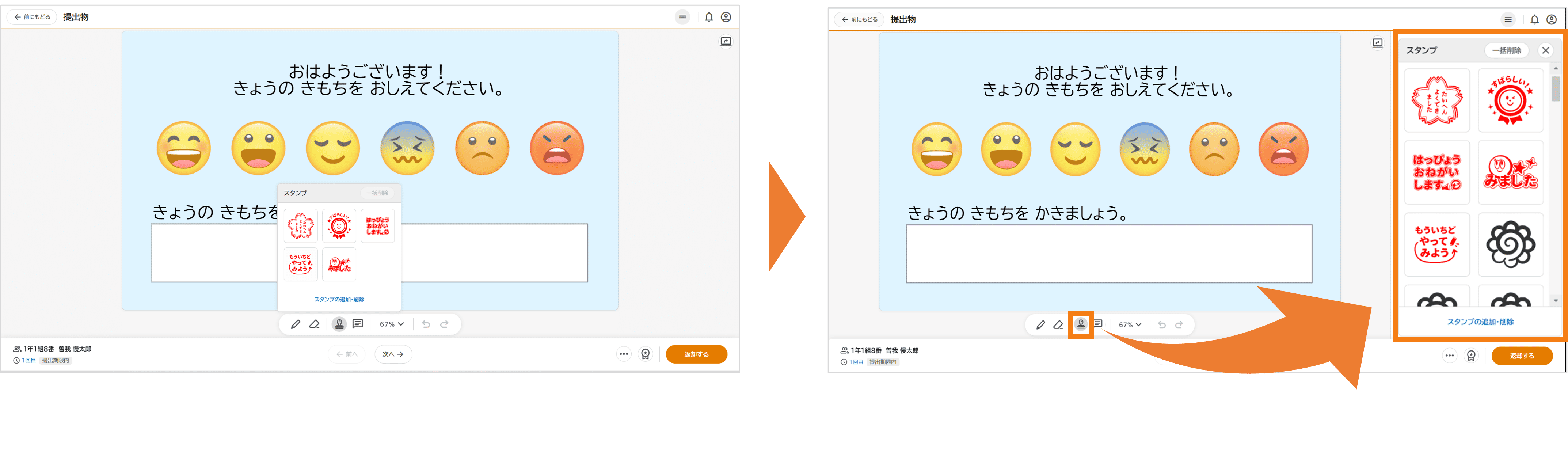 スタンプの選択画面が子どものカードに重ならず、カード全体を見ながらスタンプでの評価ができるようになるので、カードの内容確認のためにスタンプの選択画面を開いたり閉じたりする手間がなくなります。