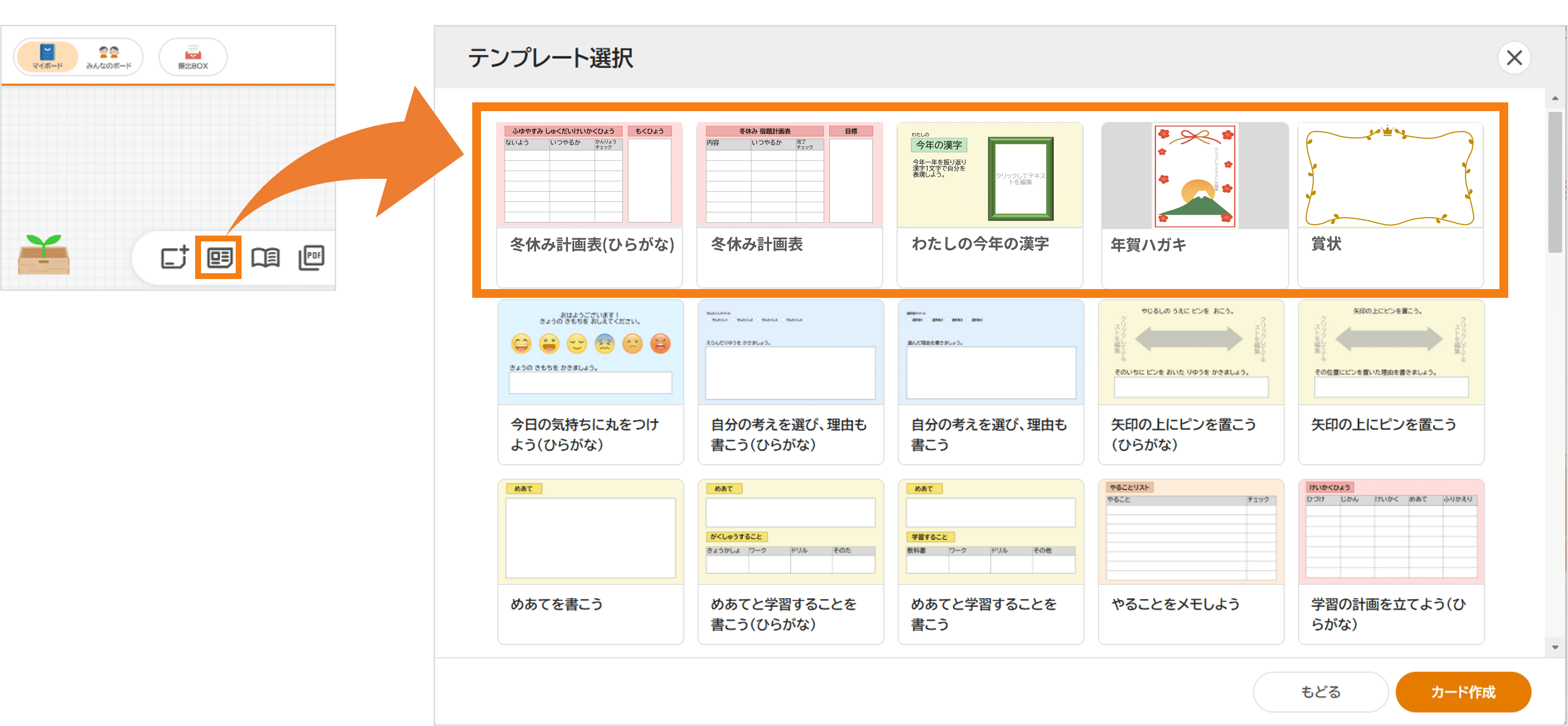 冬休みの計画立てや今年がんばったことの振り返りといった学期末の活動を、先生から子どもにこのカードテンプレートを送るだけでスムーズに行えます。