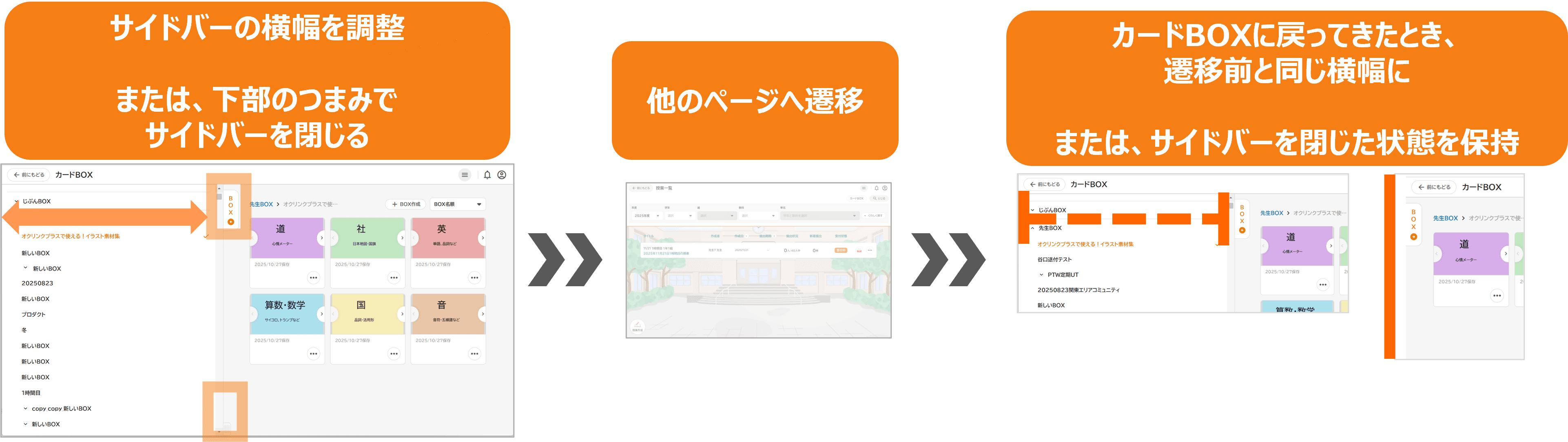 今回のリリースでは、他のページへ遷移してからカードBOXに戻ってきたときにも、直前にカードBOXを見ていたときのサイドバーと同じ横幅に固定されるようになります。