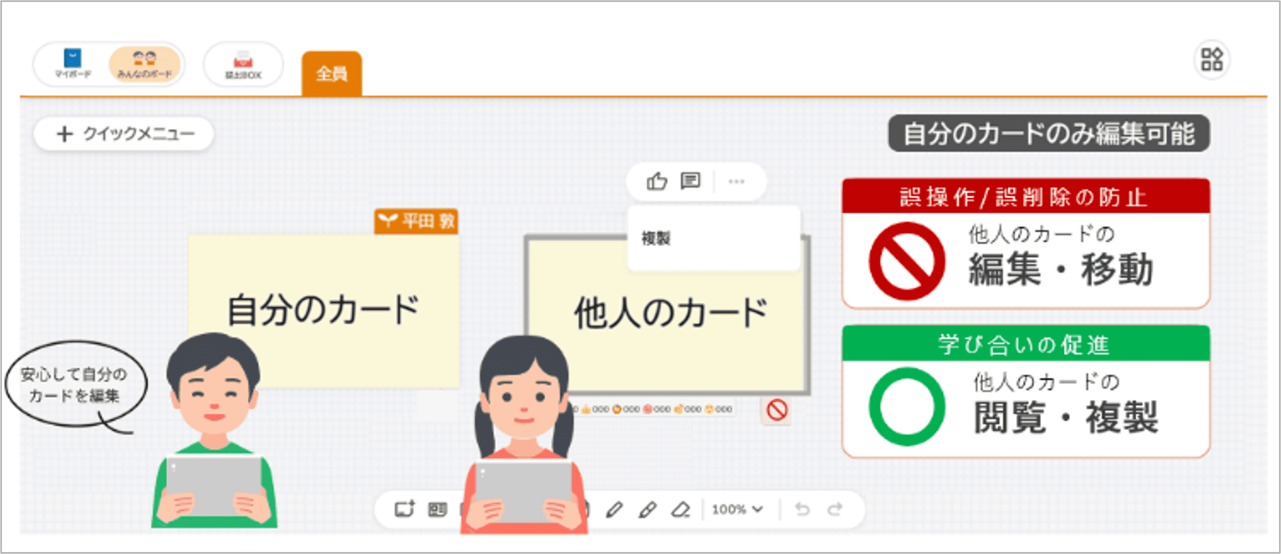 授業設定でこのモードを有効にすると、みんなのボード上で子どもたちは自分のカードだけを編集・移動できるようになり、ほかの子どものカードの編集やタブの追加ができなくなります。