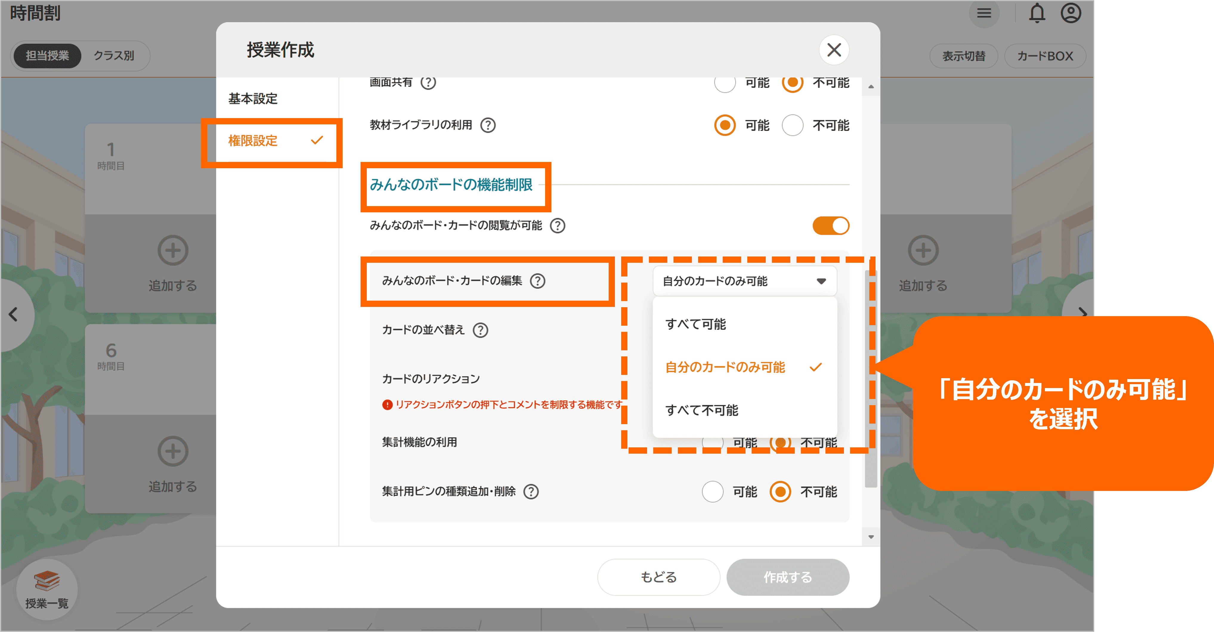 「授業作成」画面の「権限設定」内にある「みんなのボードの機能制限」で、「みんなのボード・カードの編集」のプルダウンから「自分のカードのみ可能」を選択