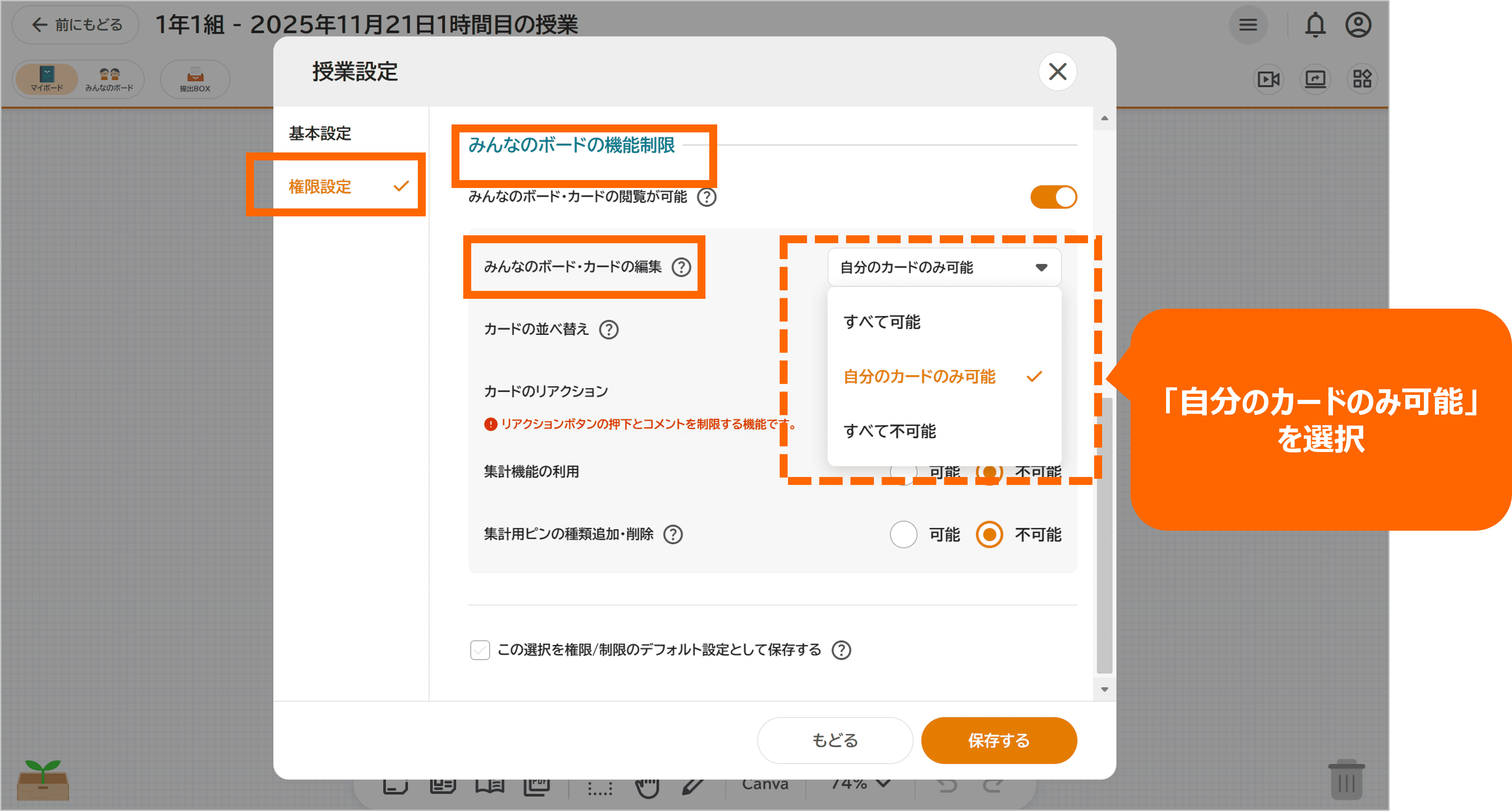 「授業設定 」画面の「権限設定」内にある「みんなのボードの機能制限」で、「みんなのボード・カードの編集」のプルダウンから「自分のカードのみ可能」を選択