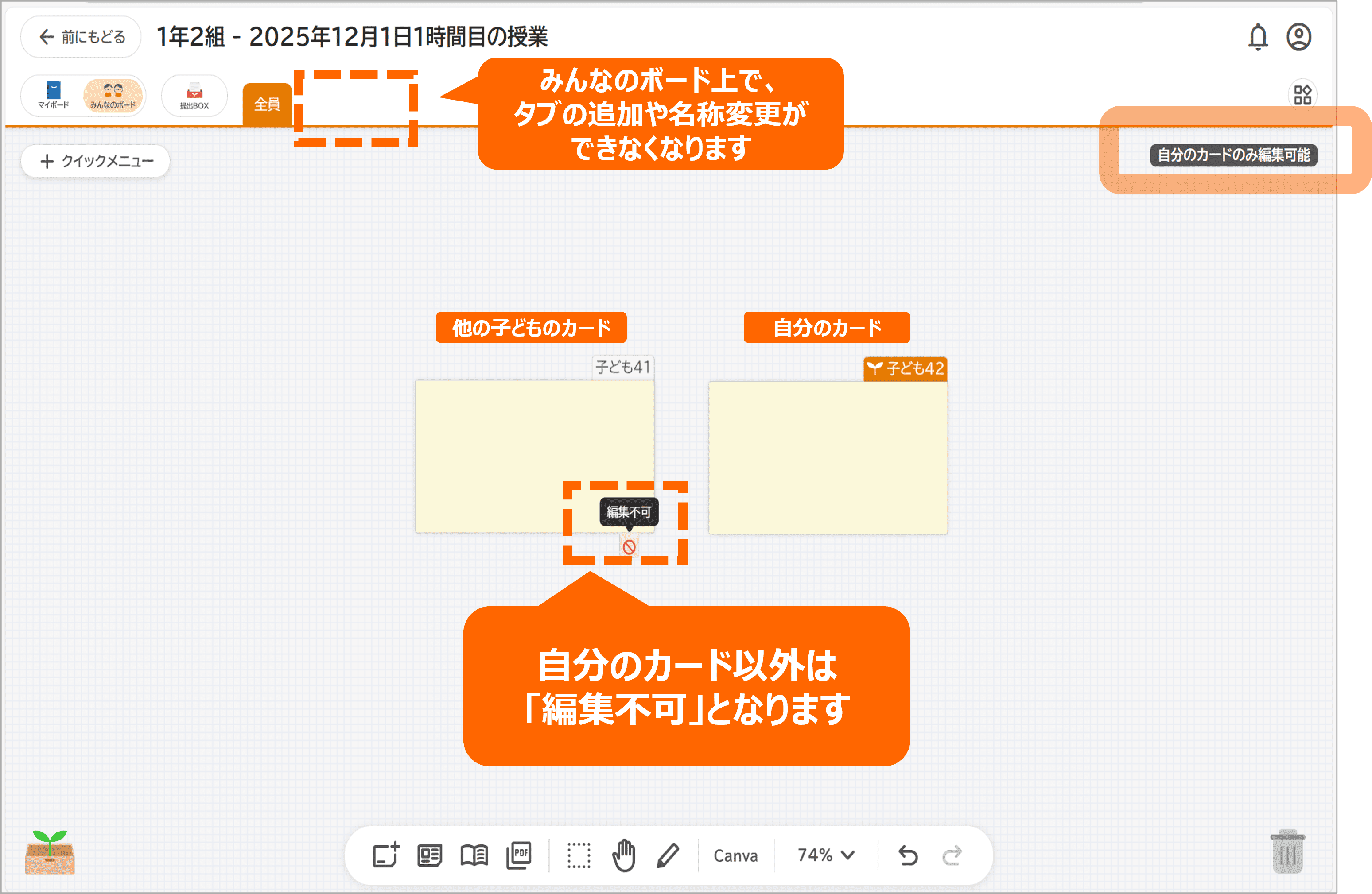 このモードに設定すると、子どもは、ほかの子どもや先生のカードの編集ができなくなることに加えて、みんなのボードのタブの新たな追加や名称変更もできなくなります。