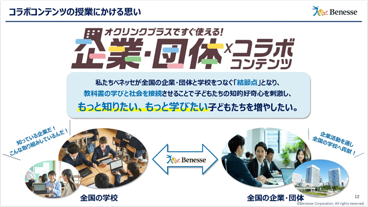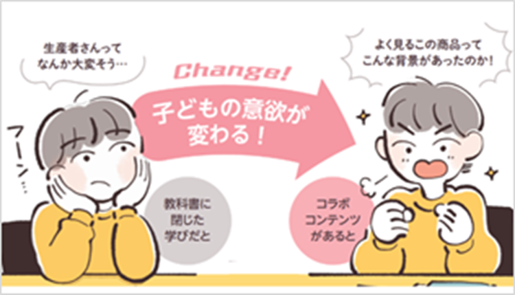 企業・団体コラボコンテンツは、授業で学ぶ内容と社会の課題や仕事とをつなぎ、子どもたちが物事を「自分ごと」として考え、探究できるようにすることをめざして開発されました。