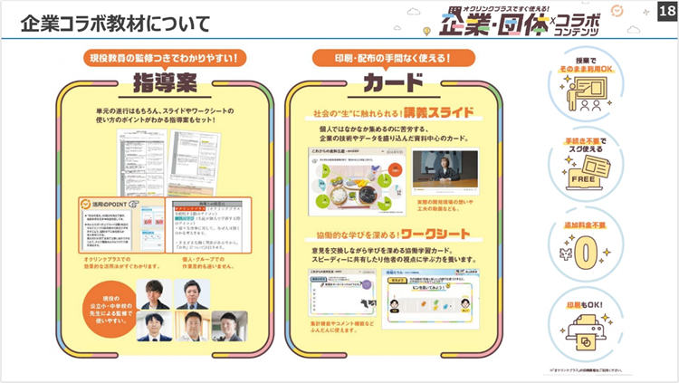 本コンテンツは、企業のノウハウやデータ、指導案をセットで提供することで、先生方が手続きや印刷なしにそのまま授業で活用でき、授業準備の負担軽減にも貢献できます。