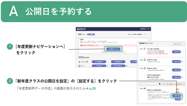 管理者画面の「年度更新ナビゲーションへ」のボタンから新年度クラスの公開日の設定を行います。新年度クラスが公開されると同時にミライシードのシステムシステム年度が繰り上がります。