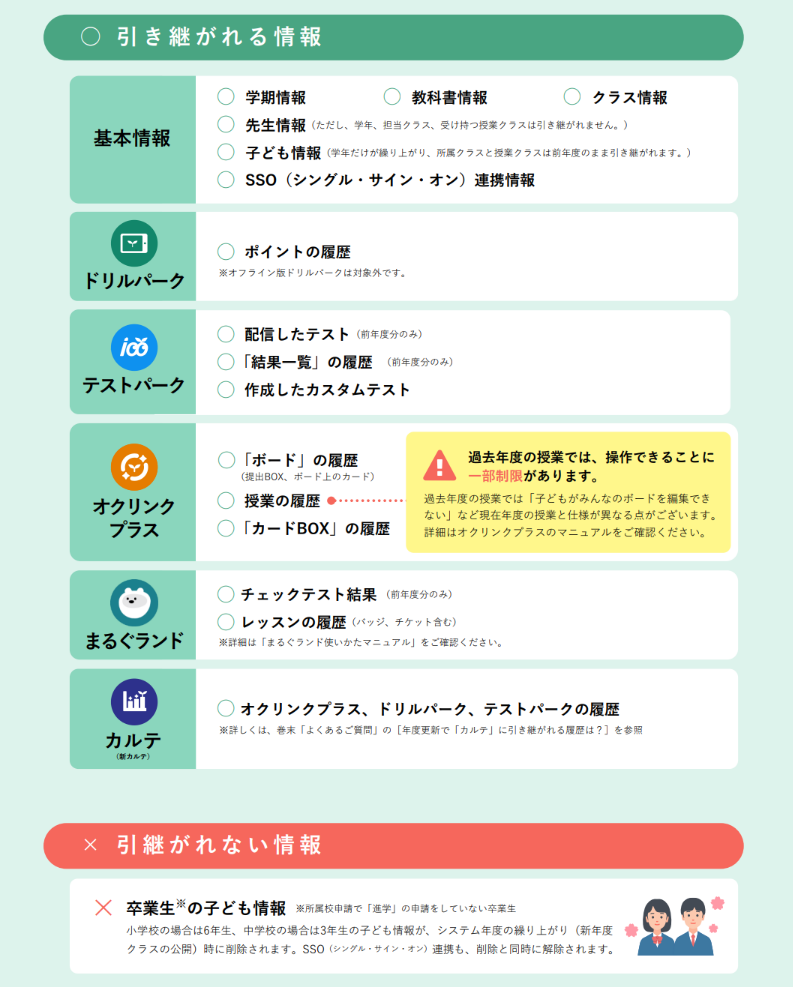 小学生の場合は6年生、中学校の場合は3年生の子ども情報が、システム年度の繰り上がり時に削除されます。SSO(シングルサインオン)連携も同時に解除されます。