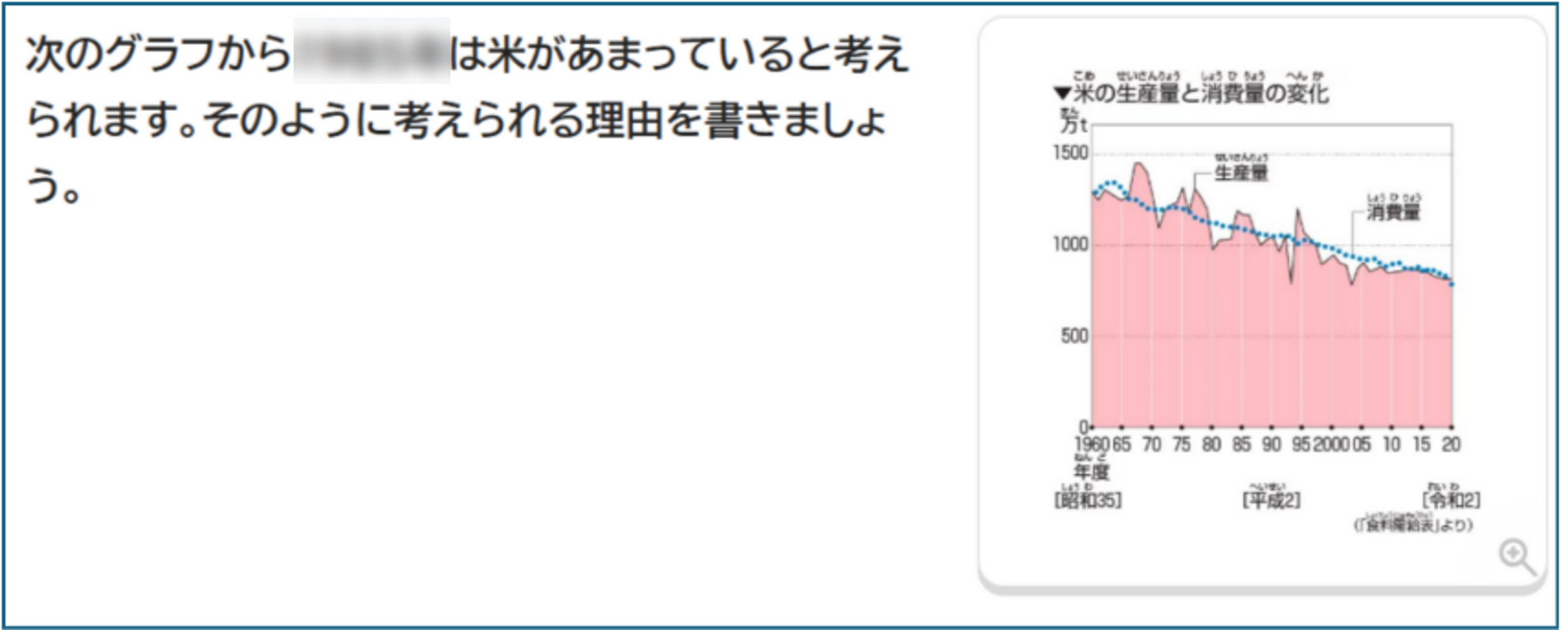 「生産量が消費量を上回ると米が余る」という教科書で学んだ知識をもとに、グラフを読み取って解答する記述式の問題で、思考力・判断力・表現力を測ります。